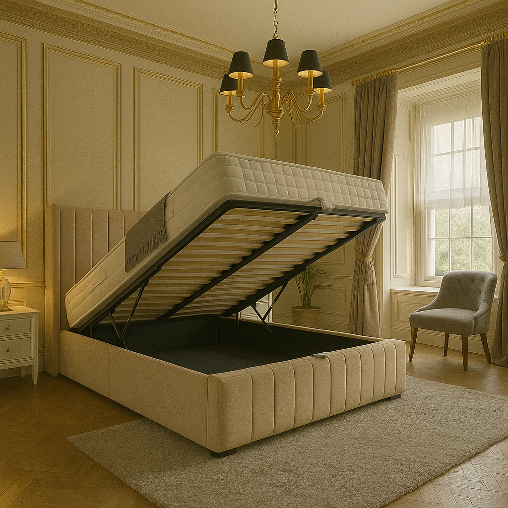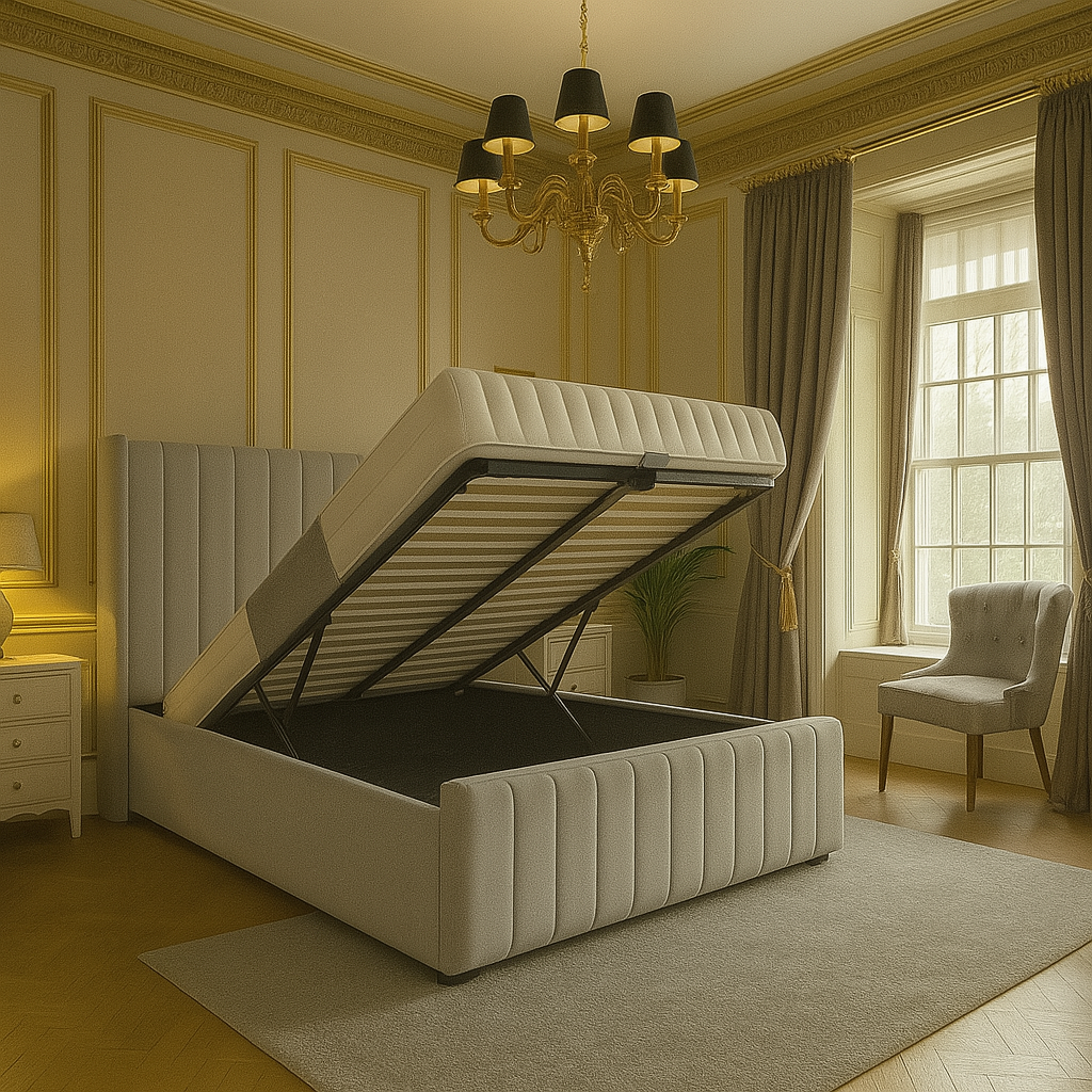 This elegant ottoman bed combines luxury and practicality with its soft upholstered frame, vertical panel headboard, and neutral tone. It features a lift-up mattress revealing spacious under-bed storage, supported by a smooth hydraulic system. Perfectly suited for upscale interiors, it’s a stylish space-saving solution ideal for Aurora Home and Living’s premium furniture collection.